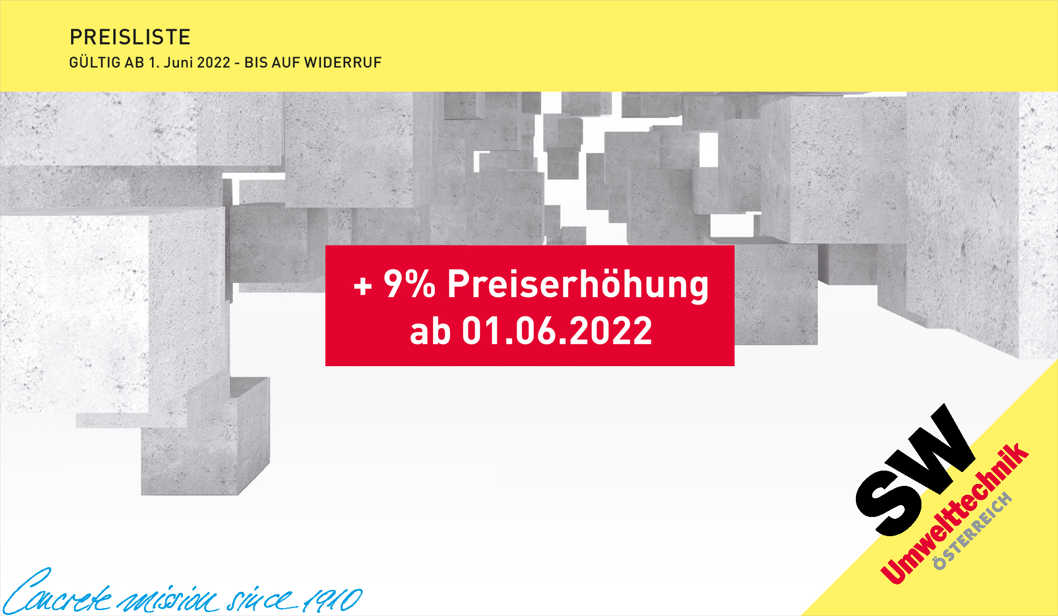Aufgrund massiver Preissteigerungen bei unseren Rohstoffen müssen wir unsere Preisliste mit 01.06.2022 um 9% anpassen. Wir bedanken uns für Ihr Verständnis und freuen uns auf eine weiterhin gute Zusammenarbeit.