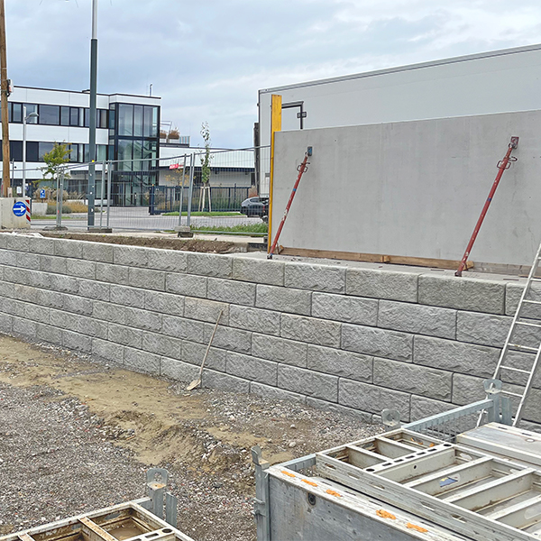 Beim Neubau der Firmenzentrale von Dennree Naturkost in Wien wurde das SW-Stützwandsystem als Stützmauer verbaut.